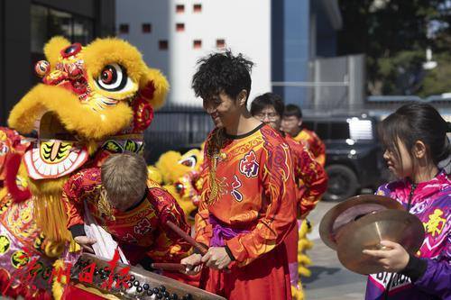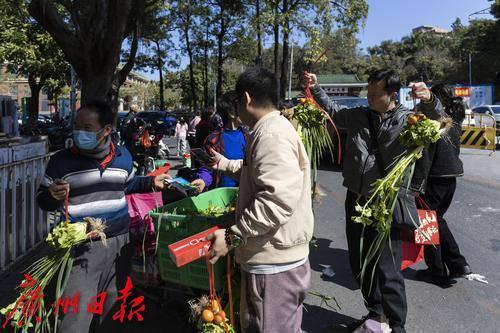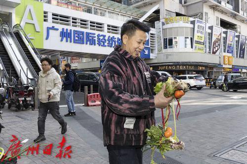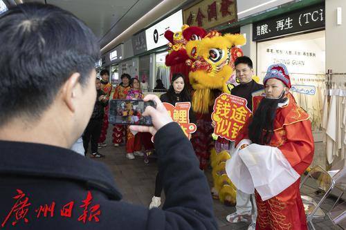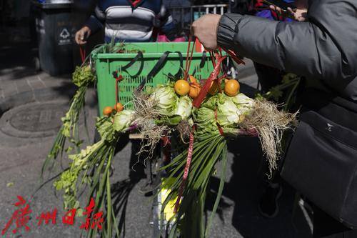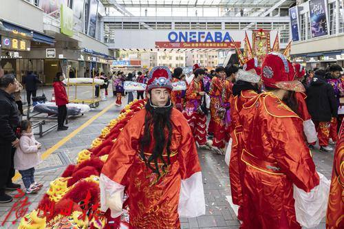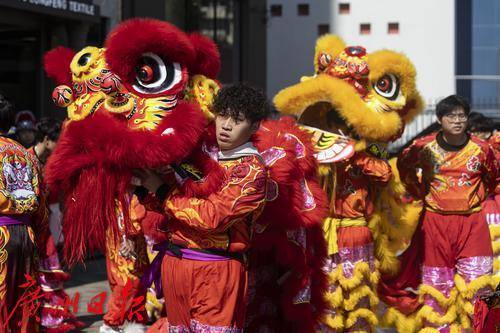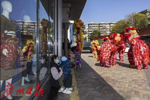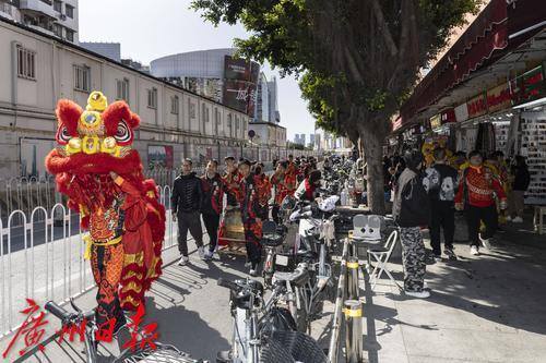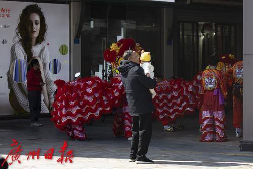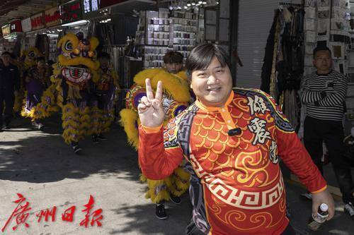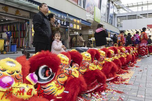2025年2月9日,广州市海珠区,欢快的锣鼓声中,舞狮在街头采青,“财神爷”装扮的年轻人在店铺间穿梭,助力中大纺织商圈开市启鸿运。街头巷尾,市民街坊、档口老板正采购“青”(生菜、蒜苗、芹菜、桔子),寓意新的一年大吉大利。