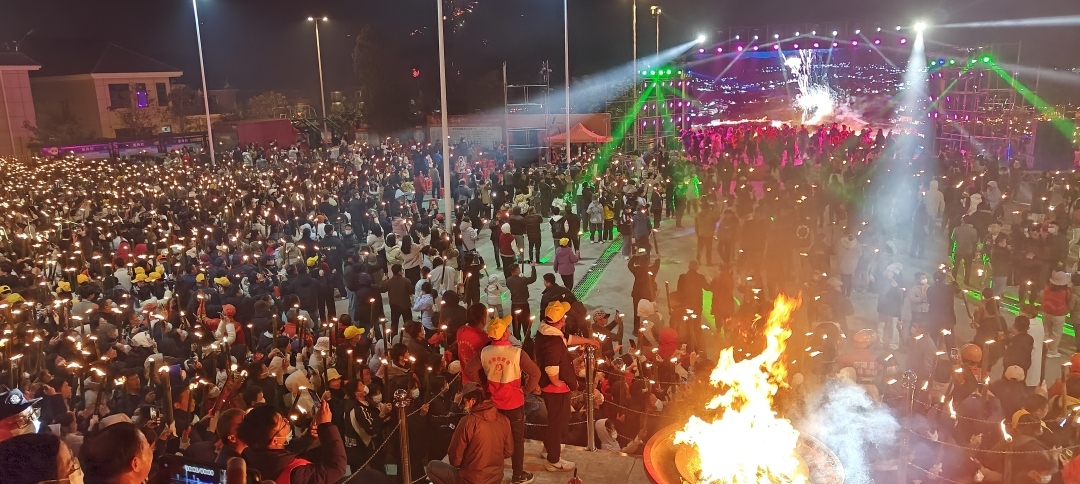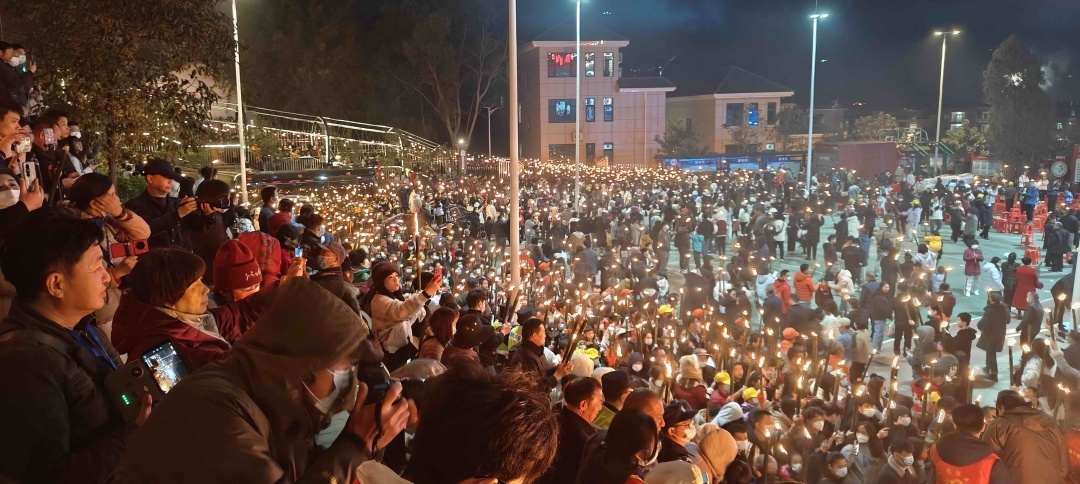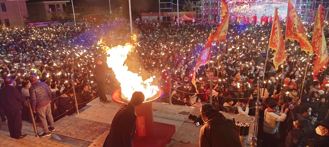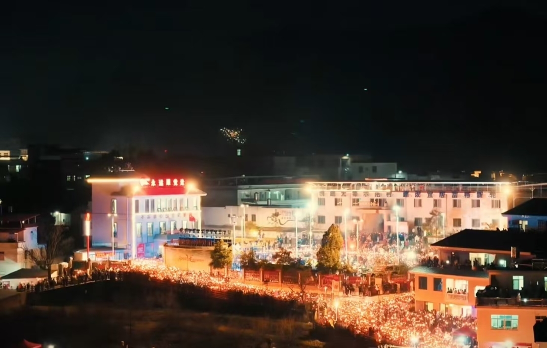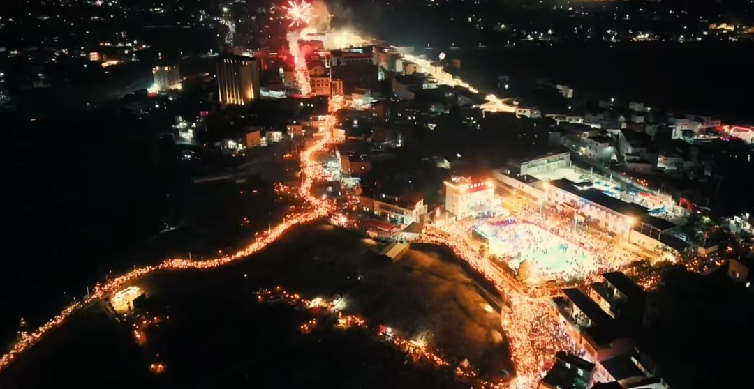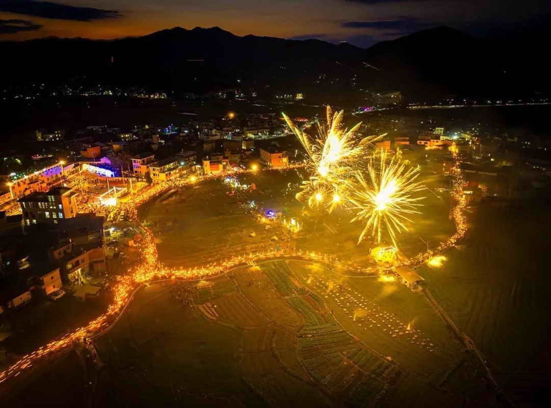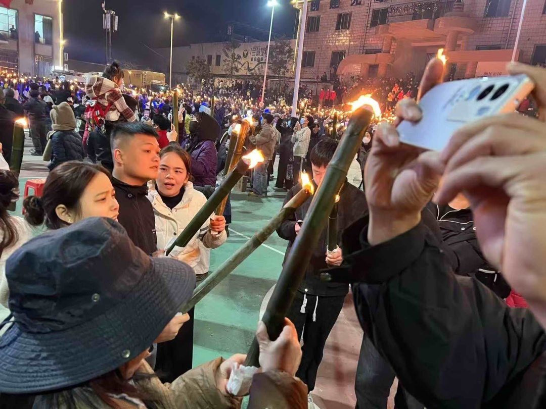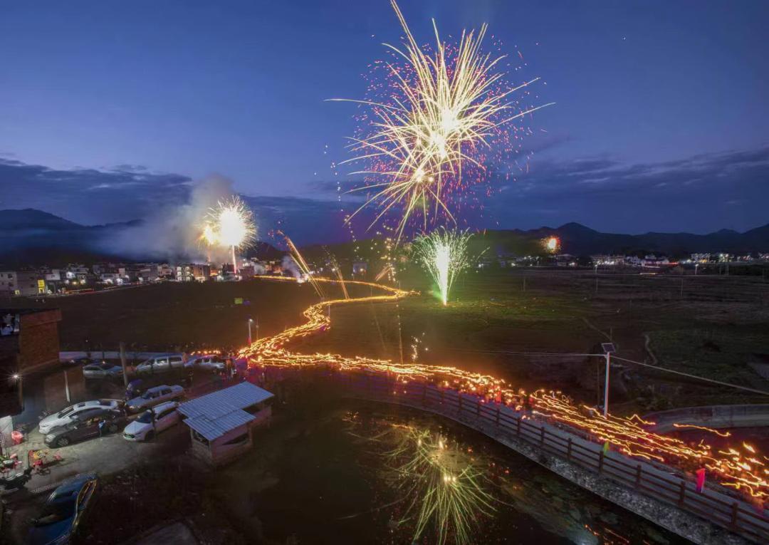 一路上,当地村民家家户户在“追龙”队伍到来之际,集中燃放烟花炮竹,欢呼声、鞭炮声此起彼伏,“火焰长龙”照亮了整个夜空,场面蔚为壮观与震撼。
