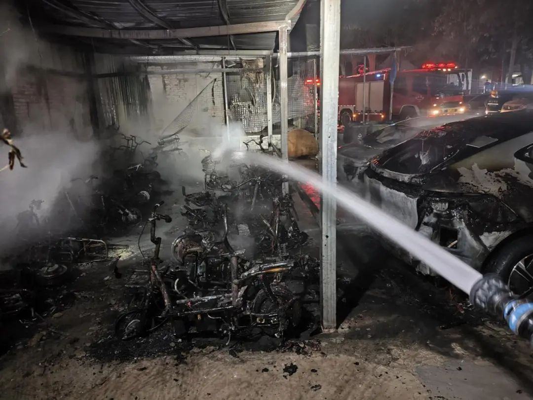 经过初步调查,起火原因疑似为电动车线路短路所致,此次火灾导致10余辆电动自行车被烧毁,2辆小轿车被引燃。