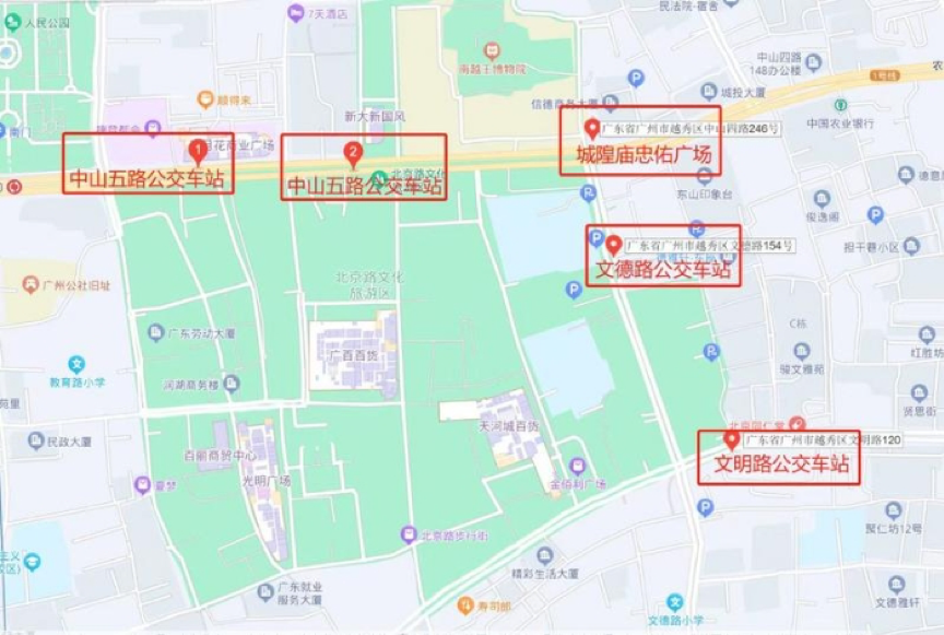 据一汽一分公司介绍,城隍庙忠佑广场、非遗街区与北京路步行街连成的会场片区内公交车站主要有3个,分别是中山五路站、文德路站、文明路站。一汽巴士一分公司途经活动会场片区的公交线路有5条,分别是1路、7路、广12路、24路、36路。