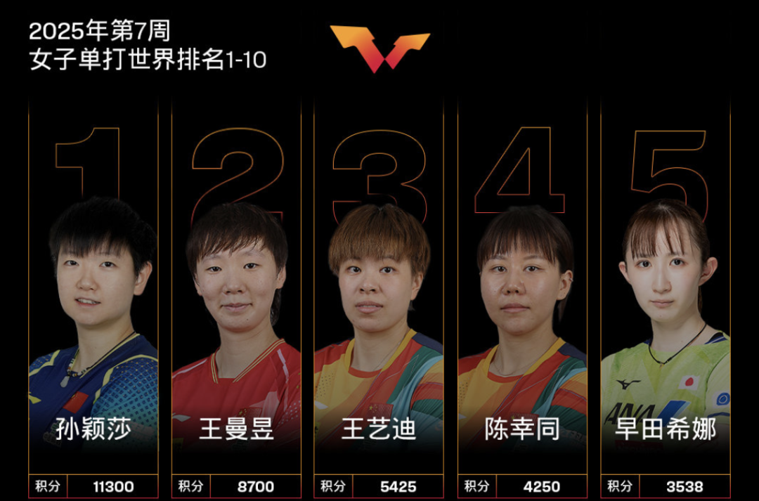中国队由孙颖莎、王曼昱、王艺迪、陈幸同包办世界前四。新加坡大满贯女单冠军为孙颖莎带来2000个积分,她本周的积分达到11300分,位列第二的王曼昱有8700分。蒯曼连升八位,从上周的第15位跳升至世界第七,刷新个人运动生涯排名新高。