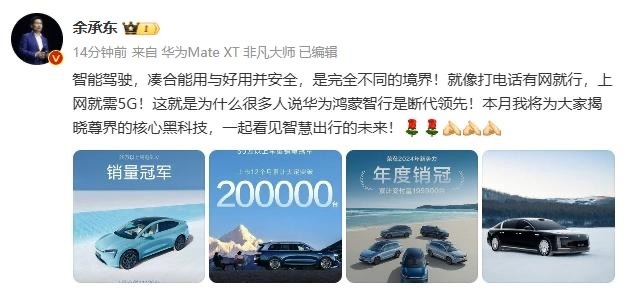 2月11日,华为常务董事、终端BG董事长、智能汽车解决方案BU董事长余承东在微博表示,智能驾驶“凑合能用”与“好用并安全”是完全不同的境界。就像打电话有网就行,上网就需5G!”他透露,本月将揭晓尊界的核心黑科技。