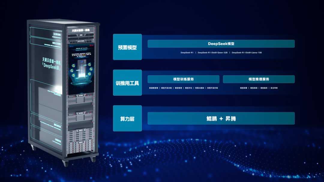 记者最新获悉,为了满足企业的私有化、国产化部署需求,2月10日,天翼云正式推出息壤智算一体机-DeepSeek版,为各行各业提供性能卓越、安全可控的智能算力解决方案。作为天翼云“息壤”智算平台的重要延伸,息壤智算一体机-DeepSeek版集国产算力、国产模型和国产云服务于一身,深度融合了DeepSeek-R1/V3系列大模型,实现了从芯片、推理引擎到模型服务的全栈国产化。