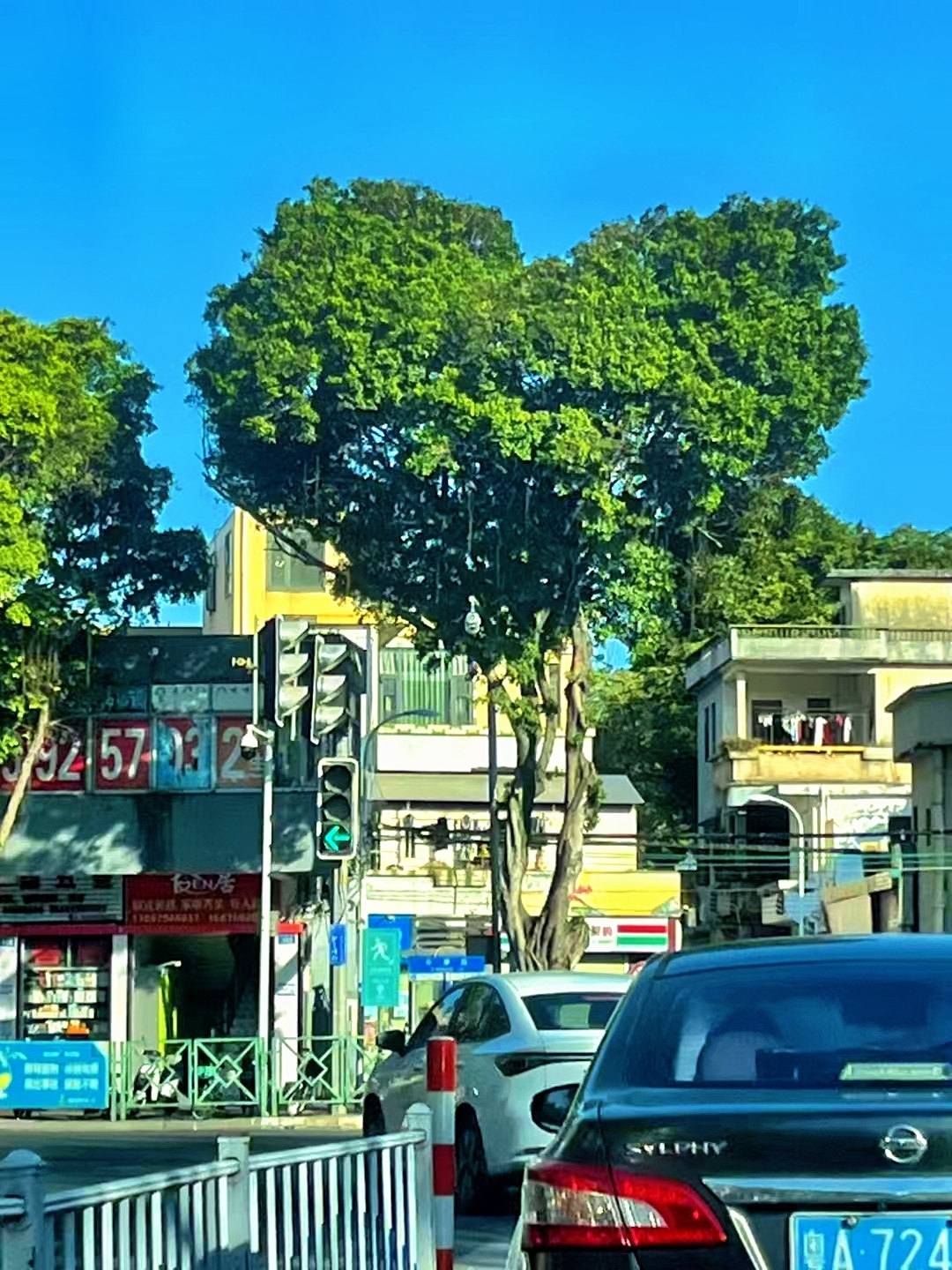 近日,广州市番禺区市桥街平康路与德兴路交界处的一棵榕树火了!因其树冠形状宛如爱心形状,被过往的路人与游客称为“爱心树”。