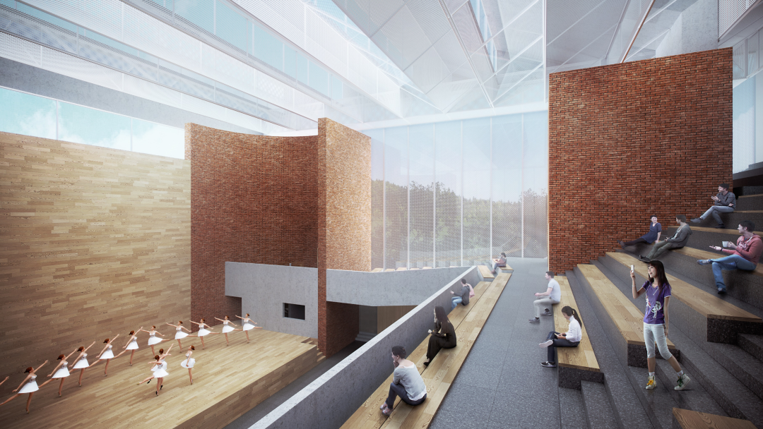 整个校园未来感十足,设计利用东西长与高差和南北窄的场地现状,由东侧入口广场到西侧操场大院,发展了步步高升的“台阶中庭大街”。中庭空间南北两侧则分别构筑“静态教学”“动态功能”的活动区域。校园院落平台则从建筑与景观交错穿插的剖面关系入手,利用下沉院落给底层大型活动空间带入自然采光,在平面和竖向之间形成丰富多元的交流平台。经由大阶梯的层层升高,将活动由入口广场带到操场大院与塔楼宿舍,形成南北的空间张力与三维序列的线性院落空间。