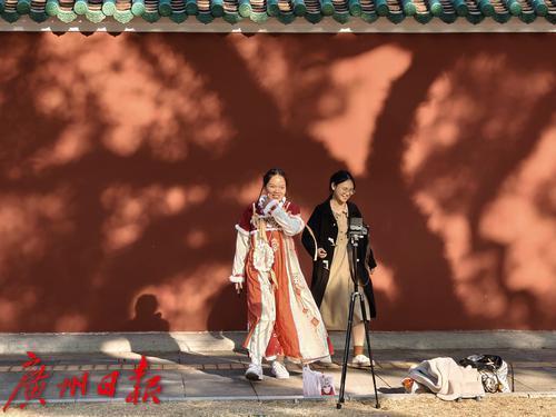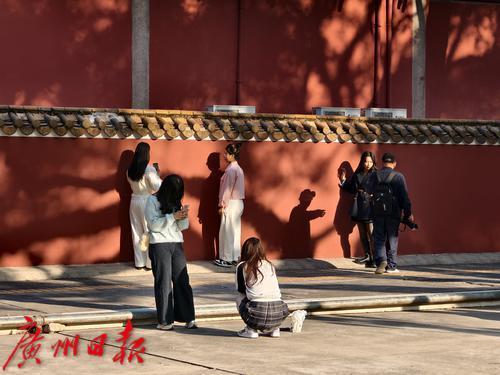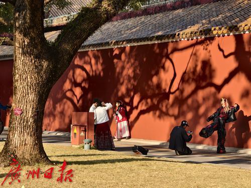 年轻人在红墙前拍照打卡。