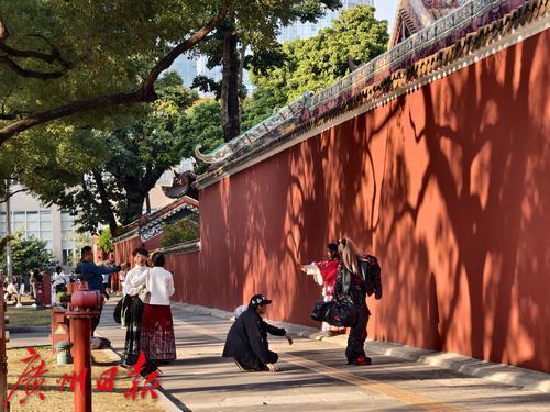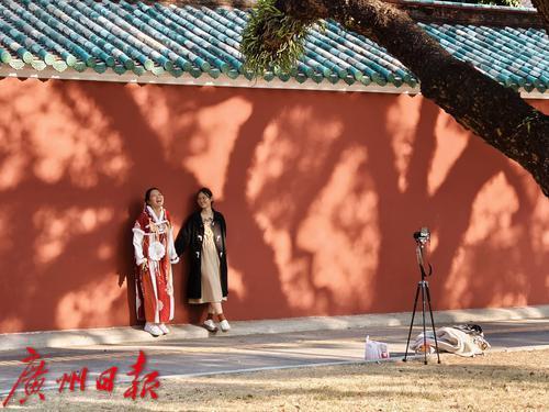 2月11日下午,在广州农讲所的红墙下,春日的暖阳洒在古老的砖瓦上,投下斑驳的树影,营造出一种宁静而祥和的氛围。人们在这里享受着悠闲的时光,或坐或站,或交谈或沉思,每个人都以自己的方式感受着这份历史的沉淀和自然的馈赠。
