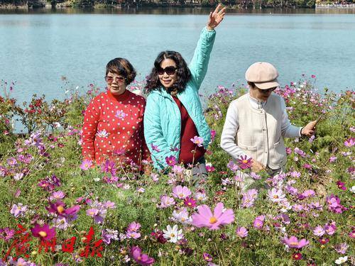 市民在花海中拍照留影。