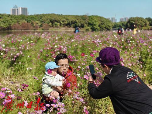 市民在花海中打卡拍照。