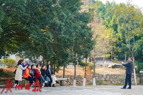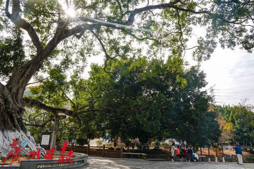 阳光洒落,游人在莲塘村的大榕树下拍照纪念。