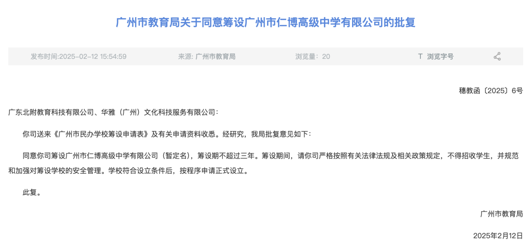 2月12日,广州市教育局官网发布关于同意筹设广州市仁博高级中学有限公司的批复。批复显示,广州市教育局同意广东北附教育科技有限公司、华雅(广州)文化科技服务有限公司筹设广州市仁博高级中学有限公司(暂定名),筹设期不超过三年。学校符合设立条件后,按程序申请正式设立。