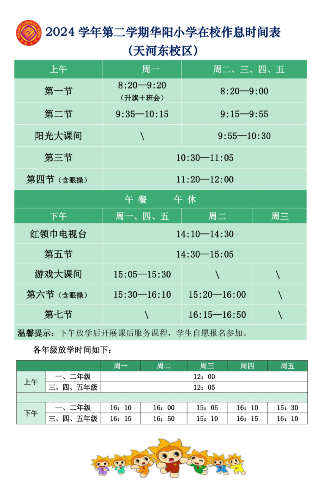 天河区华阳小学新学期作息表显示,该校周一至周五每天上午安排4节课,下午安排3节课;一二年级中午12:00放学,三至五年级12:05放学;周二至周五,学生每天上午有时长35分钟的“阳光大课间”,周一、四、五的下午,同学们还有时长25分钟的“游戏大课间”。