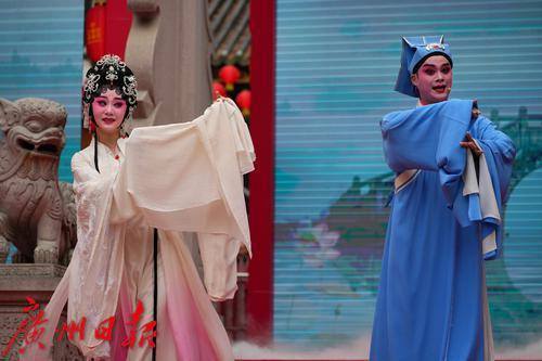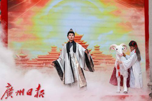 《擂鼓迎春》以鼓声敲响了广府庙会的序曲。情景表演《福降羊城》从宋代《太平广记》中汲取灵感,呈现了广府文化特色符号——羊城使者。广府文化推广大使张弛扮演羊城使者,以粤语诵读带领观众共赏元宵佳会。