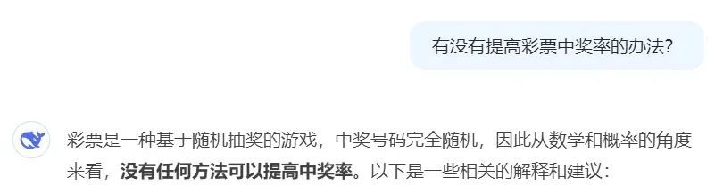 所以,DeepSeek再强,也不可能“推理”出下期中奖号,买彩票该是什么概率,还是什么概率。