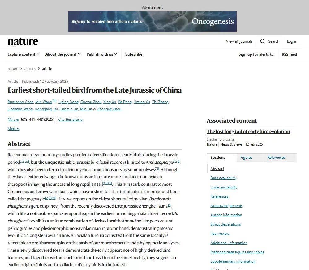 今天(13日),中国科学院古脊椎动物与古人类研究所与福建省地质调查研究院联合发布最新研究成果:通过对福建省政和动物群发现的侏罗纪鸟类化石的研究,发现全球最古老的鸟类之一——“政和八闽鸟”,也是迄今唯一确切的侏罗纪鸟类,揭示了现代鸟类的体型结构在侏罗纪晚期(距今1.5亿年)就已经出现,该研究将以尾综骨为代表的鸟类重要特征出现的时间提早了近2000万年。相关研究成果于北京时间2月13日在《自然》发表。