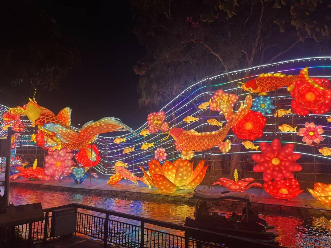 在公园北门,记者注意到,一组以锦鲤为主体的灯组吸引了大批游客和市民前来参观拍照。锦鲤在中国传统文化中被寓意为好运连连。在越秀公园北秀湖区域,一组长达128米的锦鲤带灯组横跨湖面,刷新历年湖面灯组长度,是本届灯会的一大亮点。40多条造型精美的锦鲤在夜色的映衬之下,呈现出壮观的景观效果,令人耳目一新。不少市民和游客还乘坐游船在湖面游玩,游船穿行在五彩斑斓的灯光与灯组中,成为一道独特的风景。