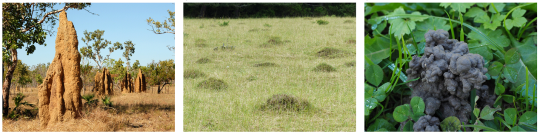白蚁、蚂蚁和蚯蚓类群产生的生物构造示意图(白蚁丘、蚂蚁丘和蚯蚓粪)
