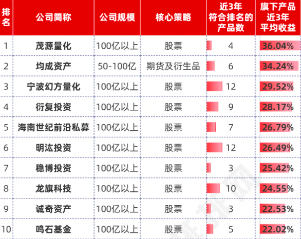 截至2025年1月底,在私募排排网有近三年业绩展示且符合排名的产品在3只及以上的头部量化私募共有22家。其中,旗下产品近三年收益均值在20%以上的头部量化私募占12家。“旗下产品近三年收益均值”居前10的头部量化私募分别是:茂源量化、均成资产、宁波幻方量化、衍复投资、海南世纪前沿私募、明汯投资、稳博投资、龙旗科技、诚奇资产、鸣石基金,其中股票策略私募占9家。