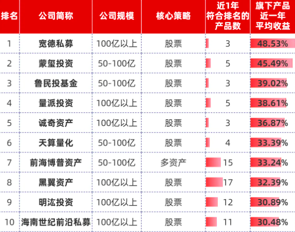 截至2025年1月底,在私募排排网有近一年业绩展示且符合排名的产品在3只及以上的头部量化私募共有31家。其中,旗下产品近一年收益均值在20%以上的头部量化私募占22家;在30%以上的占22家。“旗下产品近一年收益均值”居前10的头部量化私募分别是:宽德私募、蒙玺投资、鲁民投基金、量派投资、诚奇资产、天算量化、前海博普资产、黑翼资产、明汯投资、海南世纪前沿私募。