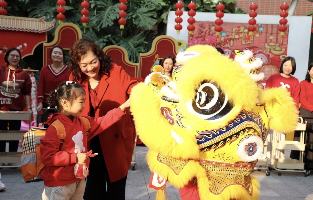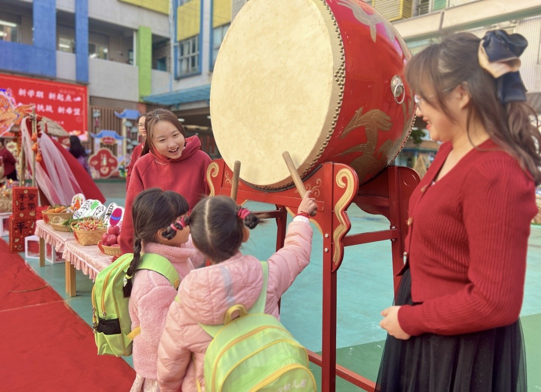 广州市番禺区大龙街中心幼儿园同样热闹非凡。门口锣鼓喧天,园内舞狮欢腾跳跃,教师们身着传统服饰迎接返园幼儿。欢庆的音乐声中,一场充满传统仪式感的庙会拉开帷幕,孩子们逛庙会、吃美食、玩游戏,沉浸在浓浓的年味儿里。