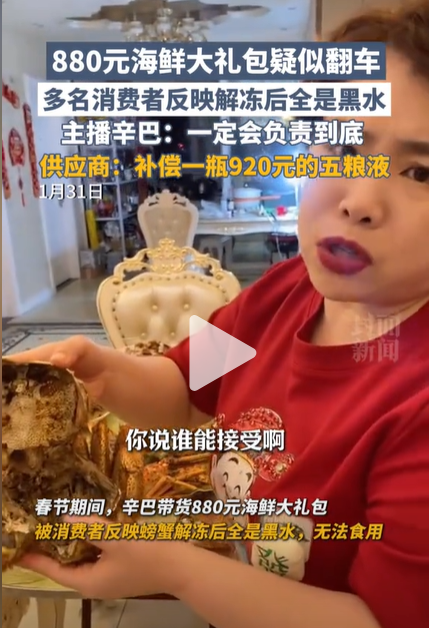 春节期间,“辛巴带货”的880元海鲜大礼包被消费者反映,螃蟹解冻后全是黑水,无法食用。辛巴发布说明并道歉,其海鲜供应商尖锋食客回应称,将赠送一瓶五粮液作为补偿。