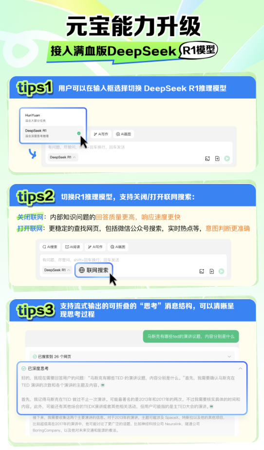 记者体验发现,腾讯元宝提供的DeepSeek支持联网搜索,并整合了微信公众号、视频号等腾讯生态信息源,能为用户提供更稳定、实时、全面、准确的回答。据介绍,腾讯元宝采用DeepSeek-R1 671B满血版,这是系列模型中能力最完整、效果最优的版本。