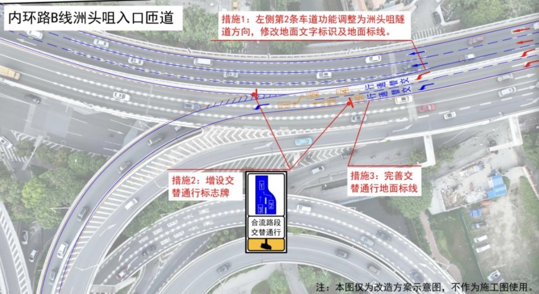 此外,为进一步优化内环路B线洲头咀入口匝道交通组织,规范交通秩序,提升通行效率,广州交警还将于近期在该路段实施“交替通行”改造措施。