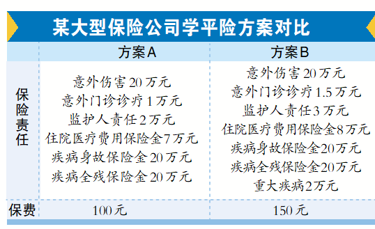 有业内人士指出,学平险中的重疾责任保额一般较低,加上孩子天性好动容易意外受伤,建议家长在选择时以意外责任保障为重心。选择更高报销额度、报销比例的产品,比住院津贴更加实用。