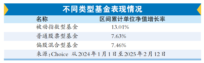 从收益来看,Choice数据显示,从2024年年初以来,截至2月12日,被动指数型基金以13.01%的平均收益率,超越普通股票型基金(平均收益率7.63%)和偏股混合型基金(平均收益率7.46%)。