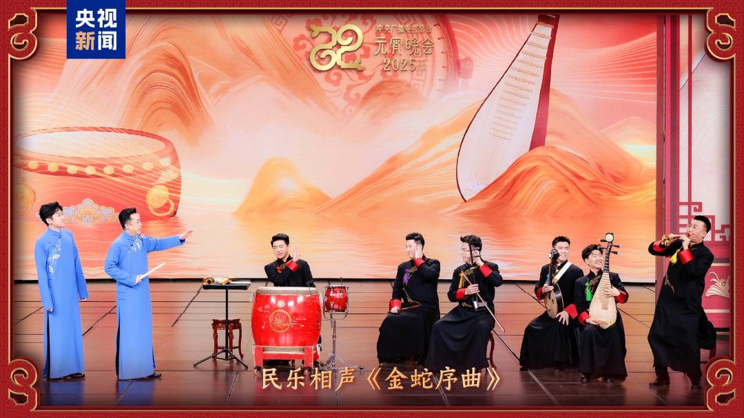 民乐相声《金蛇序曲》中,民族乐器与相声曲艺的混搭妙趣横生,网友点赞“民乐相声有巧思,有包袱”。主分会场的民乐艺术家们以笙、笛、编钟、大鼓等九种民族乐器,以及分会场的特色乐器一同隔空合奏《宫商角徵羽》,音律激昂,悠扬大气。网友盛赞节目“既有波澜壮阔,又有小桥流水,悦耳!太好听了!”