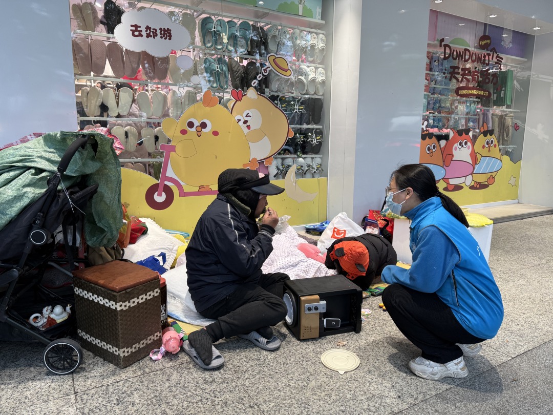 社工上街巡查,为有需要的流浪人员派发御寒衣物和食品,叮嘱加强注意保暖