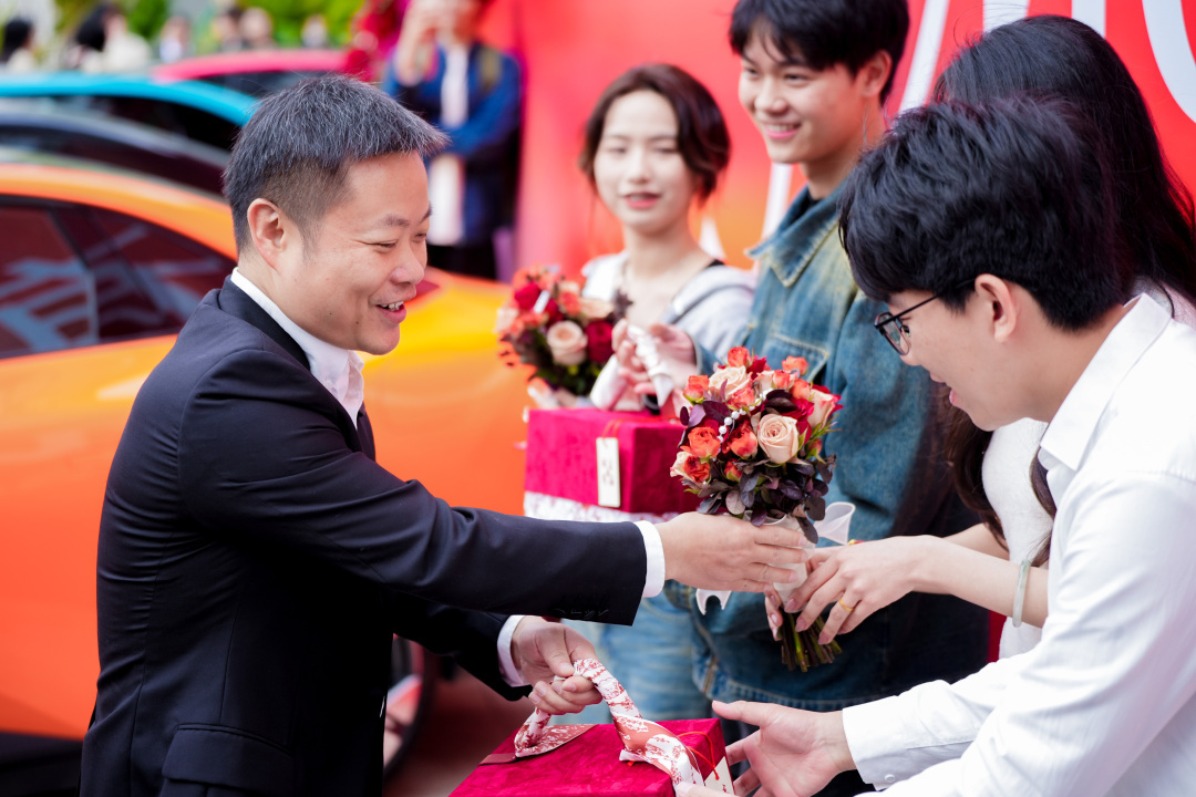 为庆贺三对新人因小鹏汽车结缘,小鹏汽车CEO何小鹏现场为他们颁发结婚登记证书,并为新人们送上美好祝福与“为AI加电”幸福礼包。