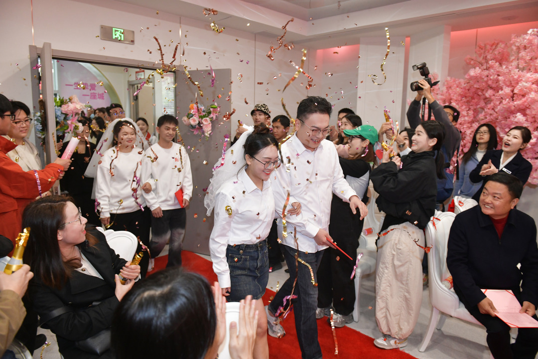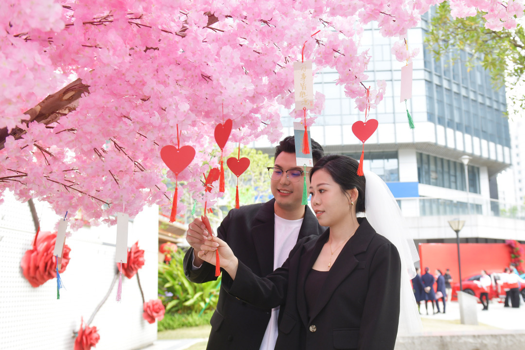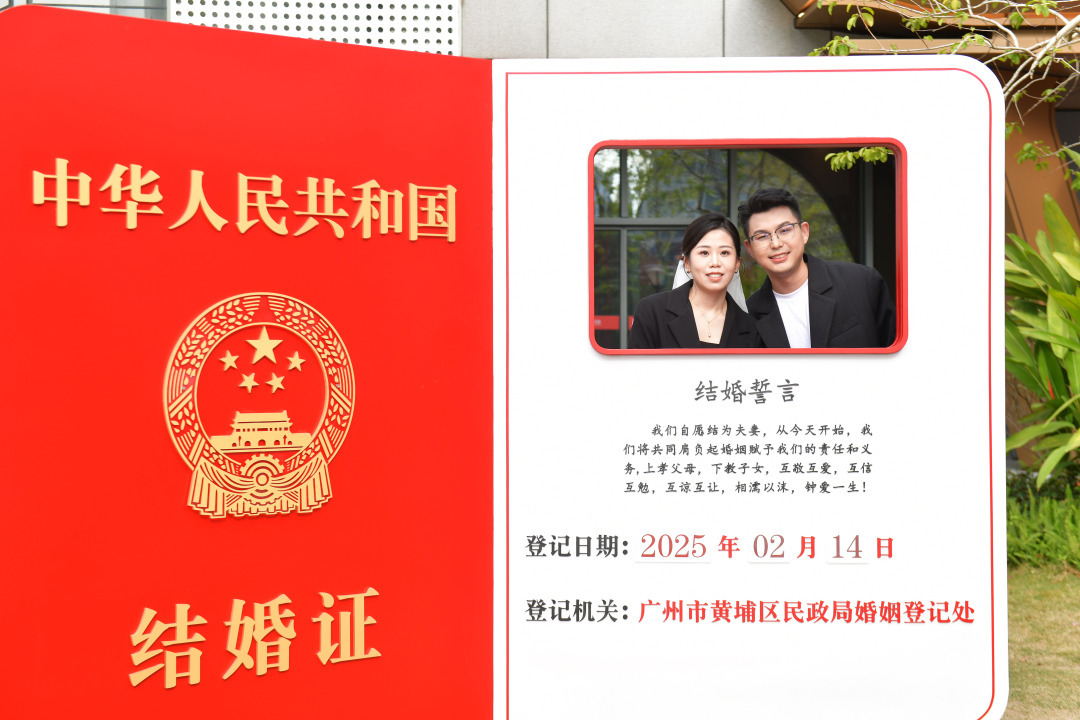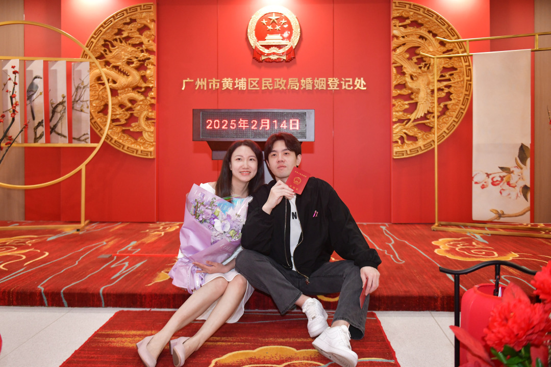 当天,黄埔区民政局联合小鹏汽车举办2025年情人节结婚登记颁证观礼活动,广州首个按5A级标准打造的婚姻登记处迎来一大批前来登记结婚的“准新人”,盖章、宣誓、打卡拍照,将结婚的仪式感拉满。当天预约结婚新人超150对,现场甜蜜度爆表。