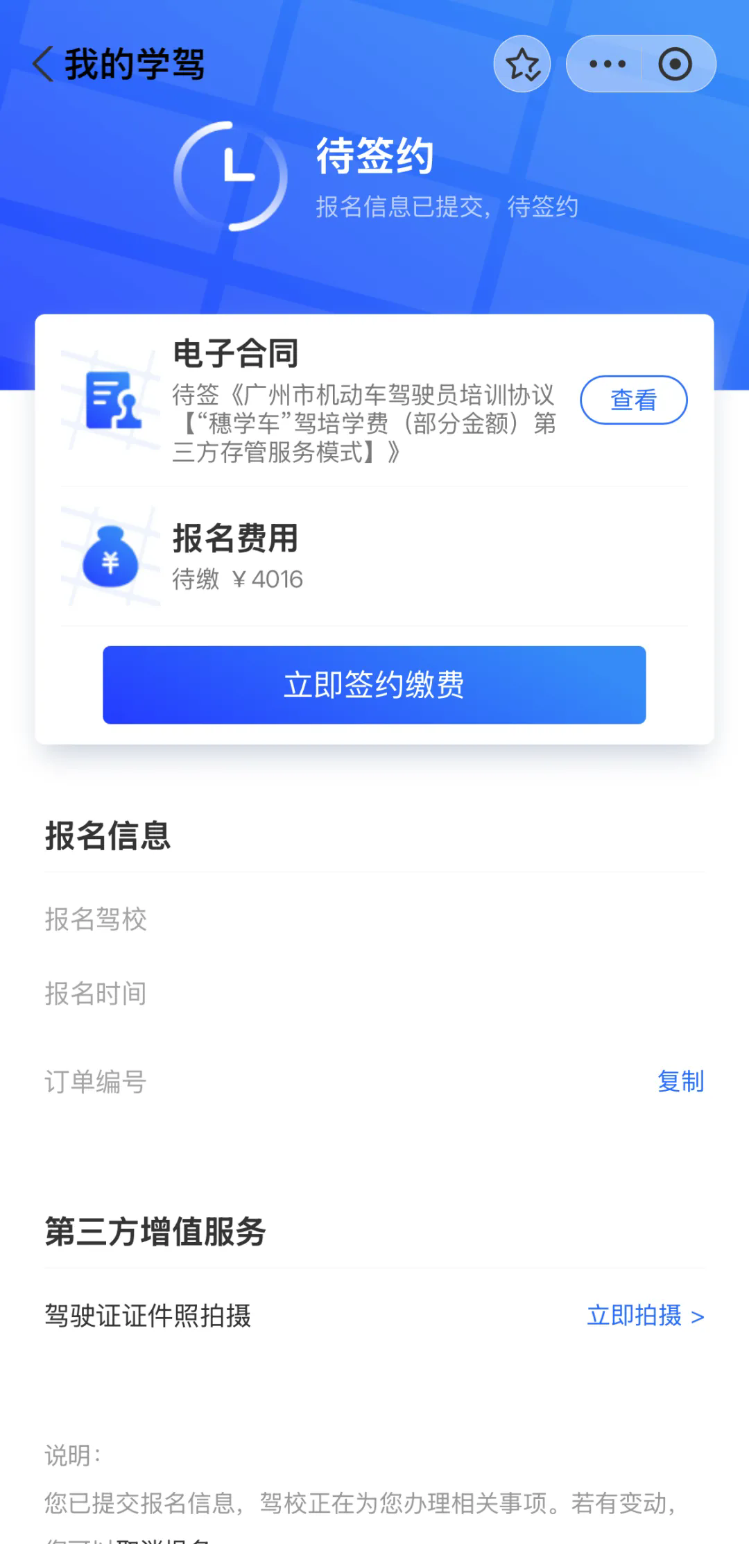 上面提到的培训协议不只是签订的时候才能看到,完成报名缴费后,大家可在“穗学车”平台找到“我的学驾”,随时查看培训协议。另外,在查看协议的同一个页面,同学们还能查看自己的学车培训进度。
