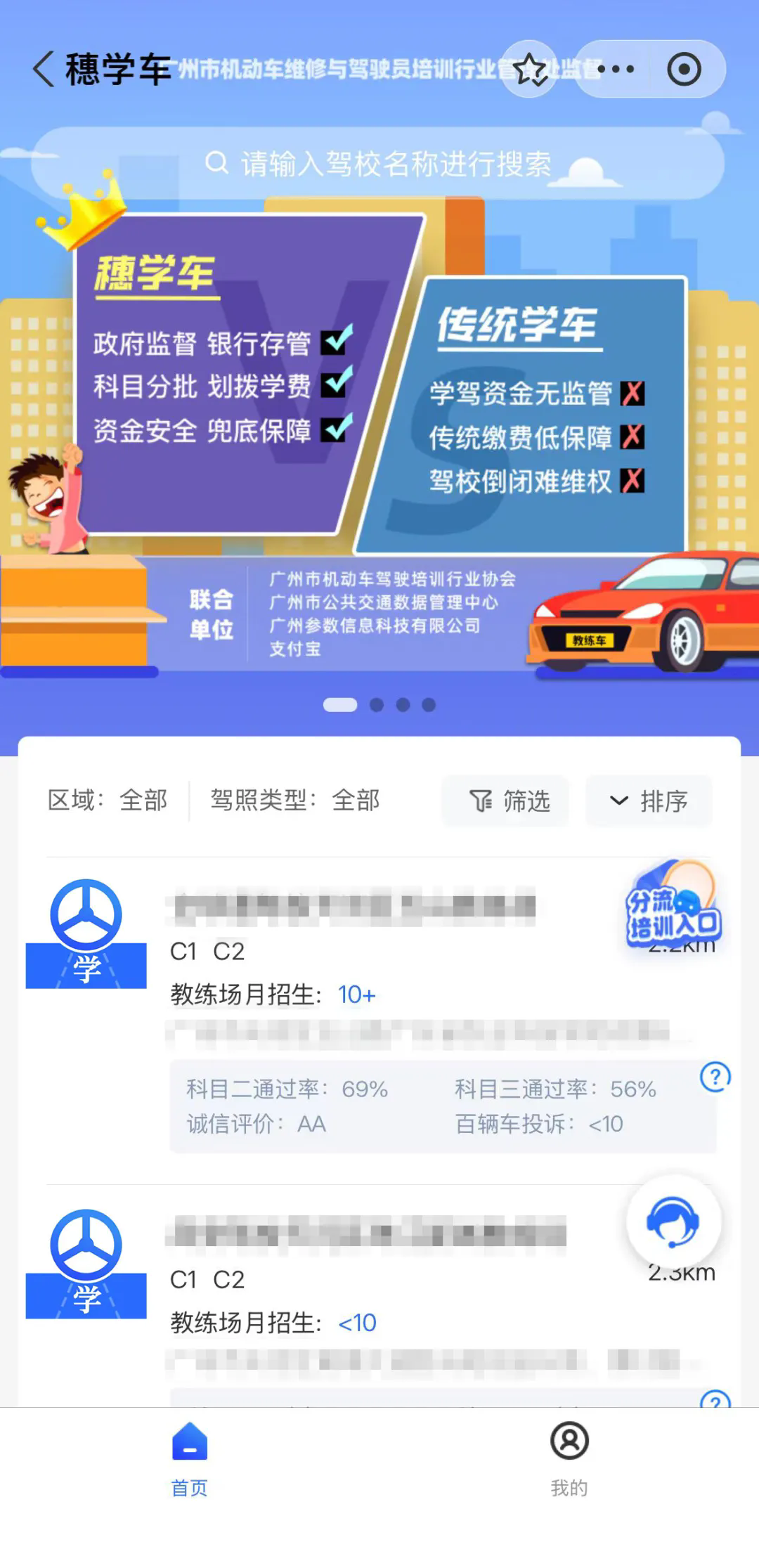 “穗学车”平台展示有驾校相关信息:科目二、科目三的通过率,年度诚信评价,百辆车投诉量,教练场月招生量等,都是选择驾校的重要指标,同学们可以根据这些指标来择优选择驾校。