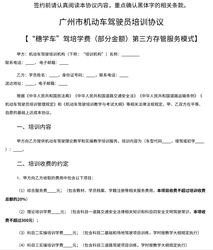 “穗学车”平台使用市驾培协会统一制式的《广州市机动车驾驶员培训协议》,该协议规范了驾校和学员双方权责,条款清晰,切实保障同学们的学车权益,建议每位同学缴费前认真阅读协议内容,并不再与驾校线下签订其他涉费协议。