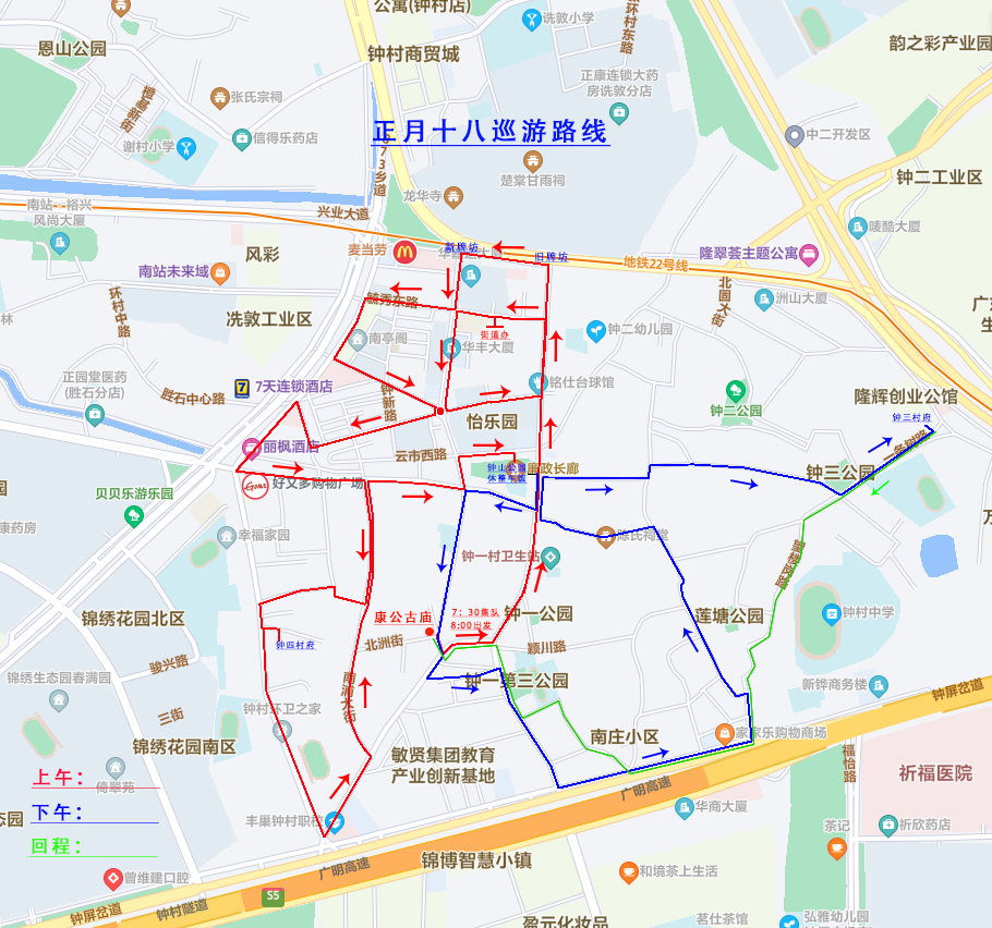 路线:8:00起,从康公古庙出发,途经钟村街道办事处-钟灵北路(锦绣文化中心)-毓秀西路-钟兴路、嘉胜路-社学西路-钟村市场-入解放路-西城大街-钟四环村路-钟四村府-解放路-云市东路-钟山公园;13:00从钟山公园出发,途经解放路-钟灵南路-人民路-新六亩路-钟一村府-担水涌路-钟韵路辅道-望楼岗路-人民路-大市街-钟三村府。