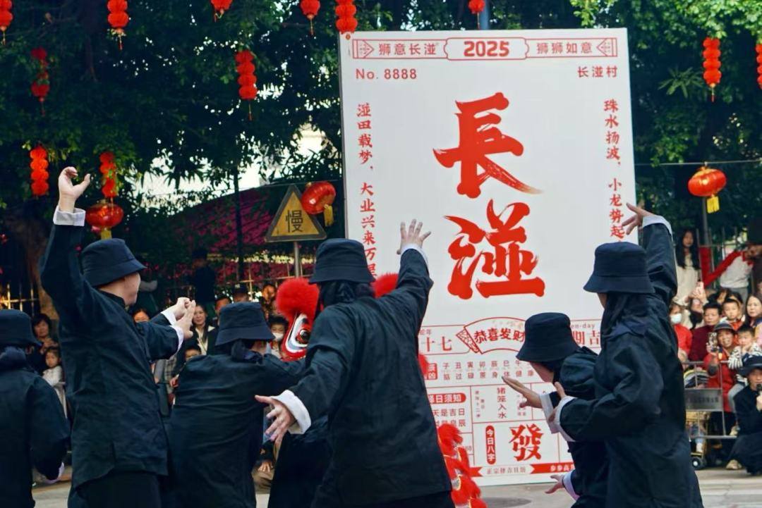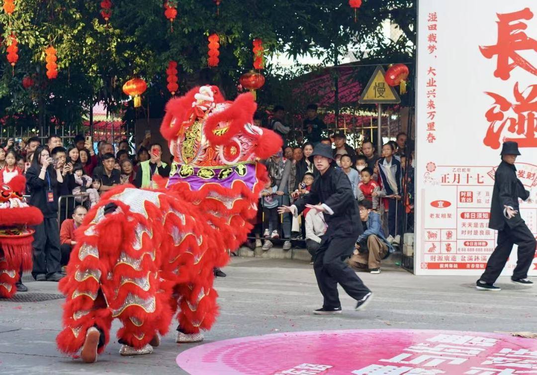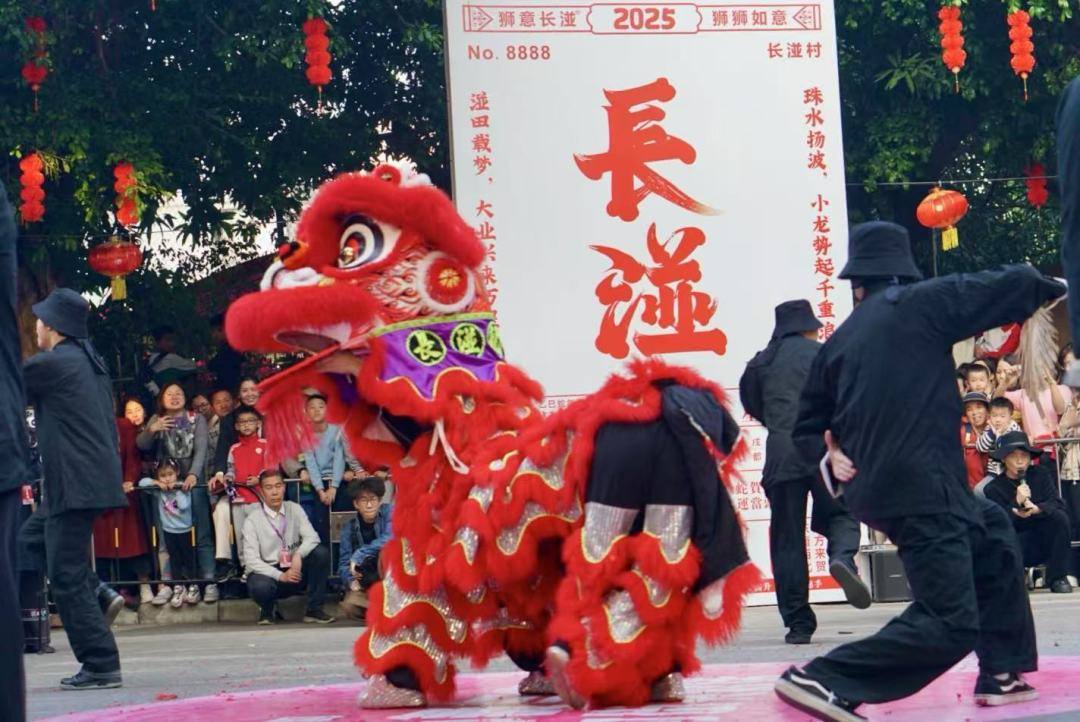 值得关注的是,今年长湴村创新性地设置了醒狮、街舞快闪环节。下午5时许,长湴龙狮体育会(第六届天河狮王)与阿牙街舞团队(中国首位街舞世界冠军团队)携手在长湴村举行了一场街头“快闪”。非遗风采与炫酷街舞街头碰撞,开启传统与现代的对话。长湴村有关负责人表示:“街舞是街头文化,那过年期间穿街过巷送祝福的醒狮同样是街头文化的代表之一,两者在街头快闪碰撞,寓意着传统文化生生不息,也祝福大家生生猛猛。”