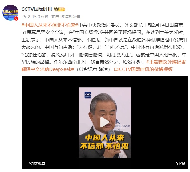 中共中央政治局委员、外交部长王毅2月14日出席第61届慕尼黑安全会议,在“中国专场”致辞并回答了现场提问。在谈到中美关系时,王毅表示,中国人从来不信邪、不怕鬼,新中国就是在战胜各种艰难险阻中发展壮大起来的。中国有句古话:“天行健,君子自强不息”。中国还有句话说得很形象,“他强任他强,清风抚山岗;他横任他横,明月照大江”。这就是中国人的气度、中华民族的品格。任尔东西南北风,我自泰然处之,岿然不动。