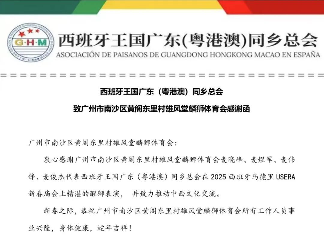 近日,广州市南沙区黄阁东里村雄风堂麟狮体育会(以下简称“体育会”)收到一封来自西班牙王国广东(粤港澳)同乡总会的感谢信,感谢麦晓峰、麦煜军、麦伟锋、麦俊杰在2025西班牙马德里USERA新春庙会上精湛的醒狮表演。此次表演不仅展示醒狮、麒麟舞等中华传统文化的独特魅力,更彰显中华文化的自信与影响力。