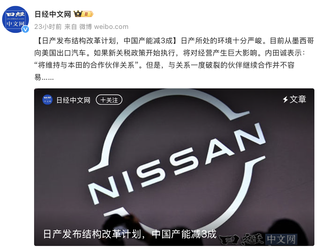 据日经新闻报道,日产汽车2月13日公布了旨在恢复业绩的详细的结构改革计划。除在泰国等地关闭3家工厂之外,还将中国的产能缩小3成。在中国市场,日产将削减50万辆的产能。此外,公司将在其他地区再削减50万辆的产能,使全球总产能降至400万辆。随着电动汽车(EV)的普及和物价上涨,汽车行业的环境正在发生剧变,日产可能面临进一步的裁员压力。