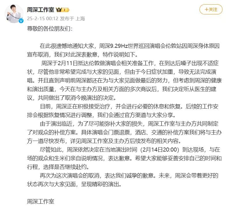 周深工作室通过社交平台发布声明,表示周深在2月11日抵达伦敦后嗓子出现不适症状,演出当天症状加重,导致无法完成演唱,考虑到周深的健康和演出质量,经过与主办方及相关方面的商议,决定听从医生的建议,取消当晚的演出。目前,周深正在积极接受治疗,并会进行必要的休息和恢复。