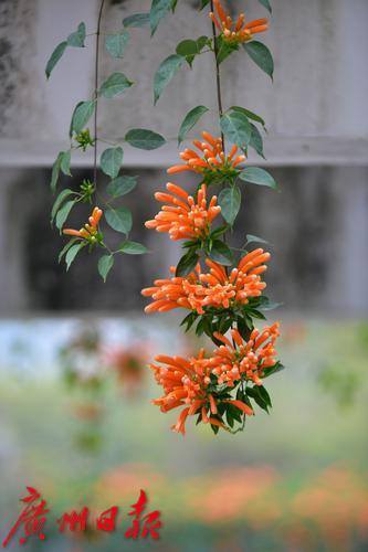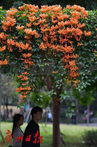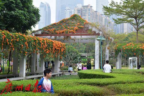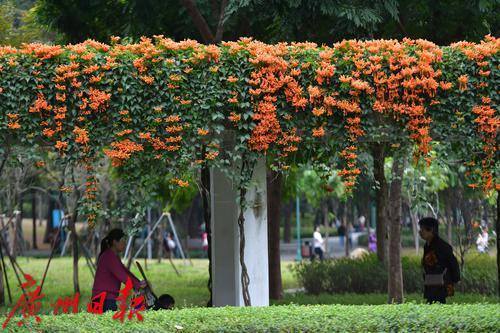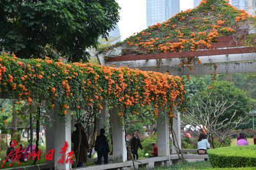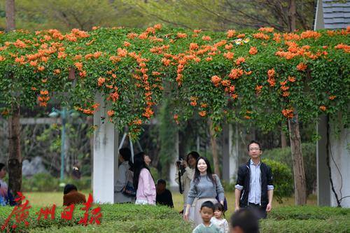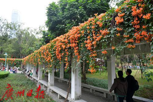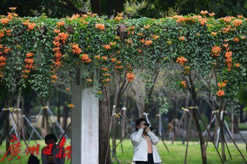 珠江公园的炮仗花盛开了,游乐园旁的廊道屋顶满是橙色的炮仗花,就像是戴了一顶长长的橙色的花帽,盛开的炮仗花吸引了众多游客观赏。