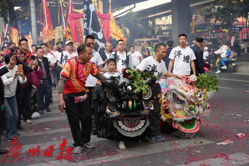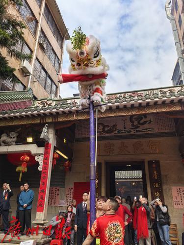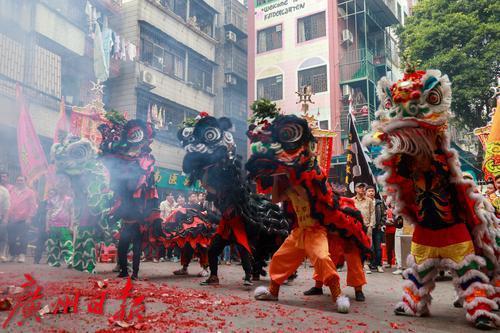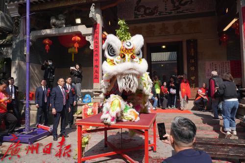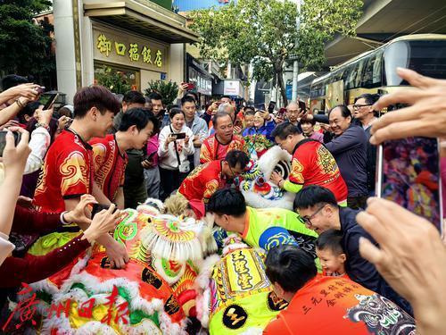 古老的祠堂前,阳光洒在11头威风八面的醒狮身上,红、黄、黑等色彩相互交织,在锣鼓声的伴奏下,它们时而相互嬉戏、你追我赶,时而各自展示绝技、腾挪翻转,灵动的眼神、细腻的肢体动作,仿佛赋予了醒狮生命,赢得群众的阵阵喝彩。