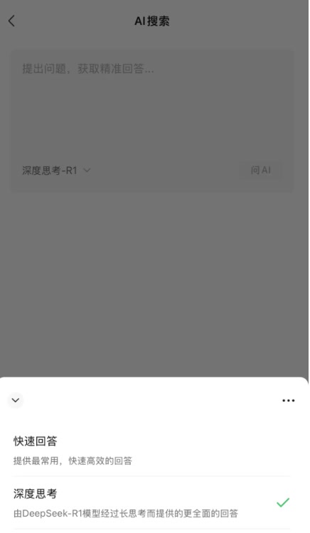 据介绍,该入口在微信首页上方的搜索框,用户点开会出现一个“AI搜索”功能。由于处于灰度测试状态,只有部分被选中的用户可以看到。在AI搜索栏输入内容后,用户可选择“深度思考”,即DeepSeek-R1模型,在“快速回答”功能外,获得经过长思考而提供的更全面回答。