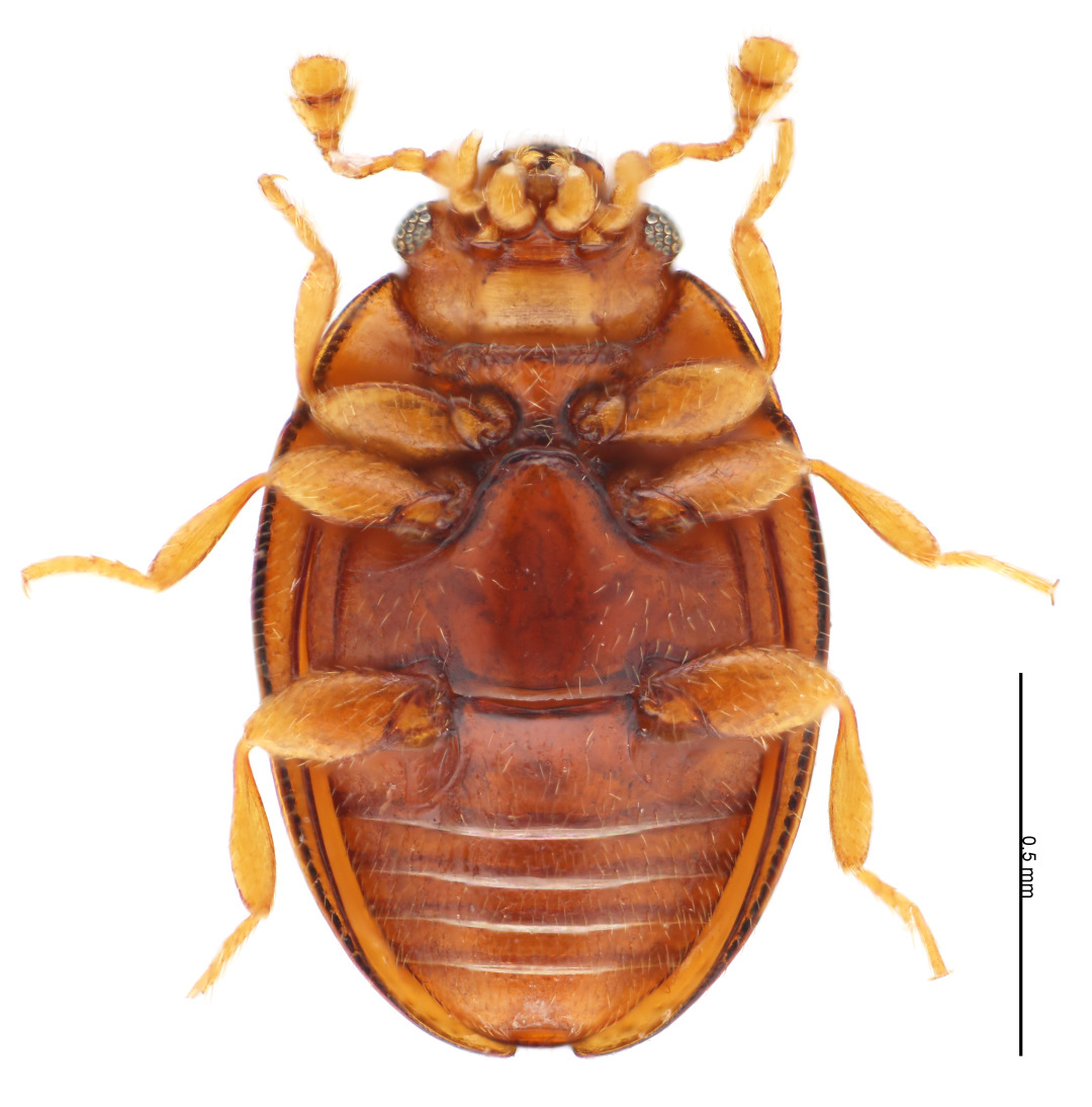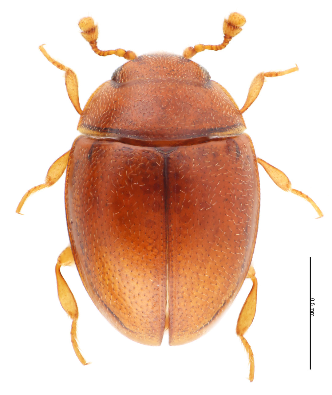 该新种体长1.2~1.3毫米,椭圆形,背侧和腹侧凸;红棕色,足和触角颜色较浅;表面无毛,被稀疏和短的黄色刚毛。调查中一共在海珠湿地发现3头标本,发现地点分别为湿地二期及湿地三期研学空间,周边生境以龙眼、荔枝等果树为主。
