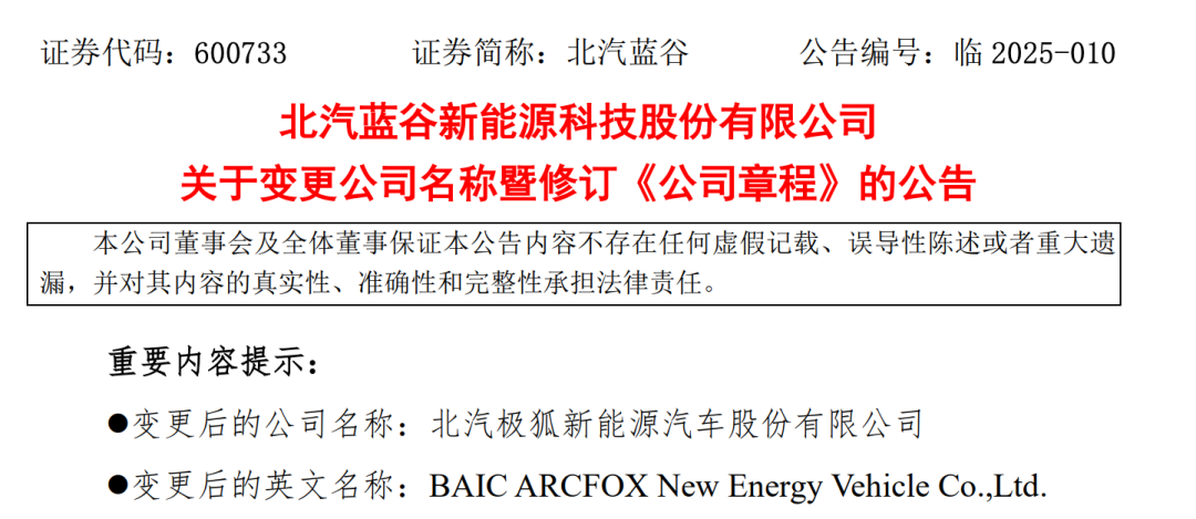 针对变更公司名称的原因,北汽蓝谷在公告中表示,公司现阶段处于战略升级关键期,改名原因是为了进一步聚焦新能源汽车主业,强化品牌在市场中的辨识度与影响力,同时旨在以全新的企业形象,更好地契合公司本公司董事会及全体董事保证。