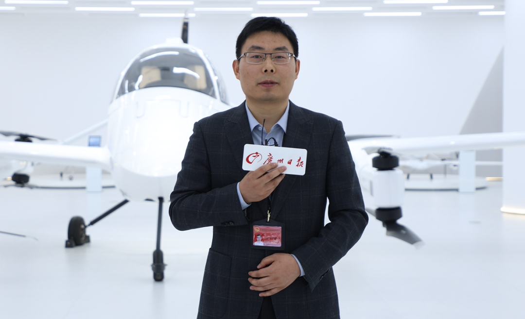 黄埔区穗港码头,一架银白色电动垂直起降航空器(eVTOL)前人头攒动。这架融合新能源技术与航空工业智慧的“未来飞行器”,正是广州市人大代表、亿航智能总设计师陈腾飞所在企业的研发成果。