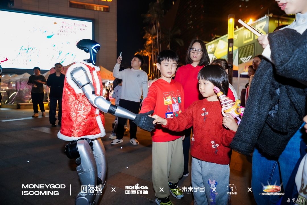 传统文化特色拉满的同时,四海城元宵节活动也不乏科技元素。今年央视春晚上,表演“赛博秧歌”的机器人火爆出圈,四海城斥资购买了春晚同款宇树科技机器人,为市民带来前沿科技的震撼。身着喜庆红色马甲的它不时出现在现场各个角落,让市民惊喜不已,争相与它握手合影。