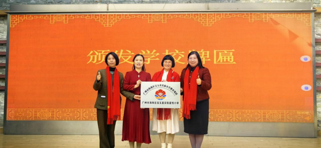 近日,广州市海珠区宝玉直实验星悦小学(原工业大道中小学,以下简称“星悦小学”)正式揭牌,海珠区教育局相关负责人在揭牌仪式上宣读学校更名文件,宝玉直实验小学(以下简称“宝实”)教育集团总校长赖海虹为星悦小学校长钟春玲颁发集团成员校牌匾,标志着这所学校正式加入宝实教育集团,开启了集团化办学的新篇章。